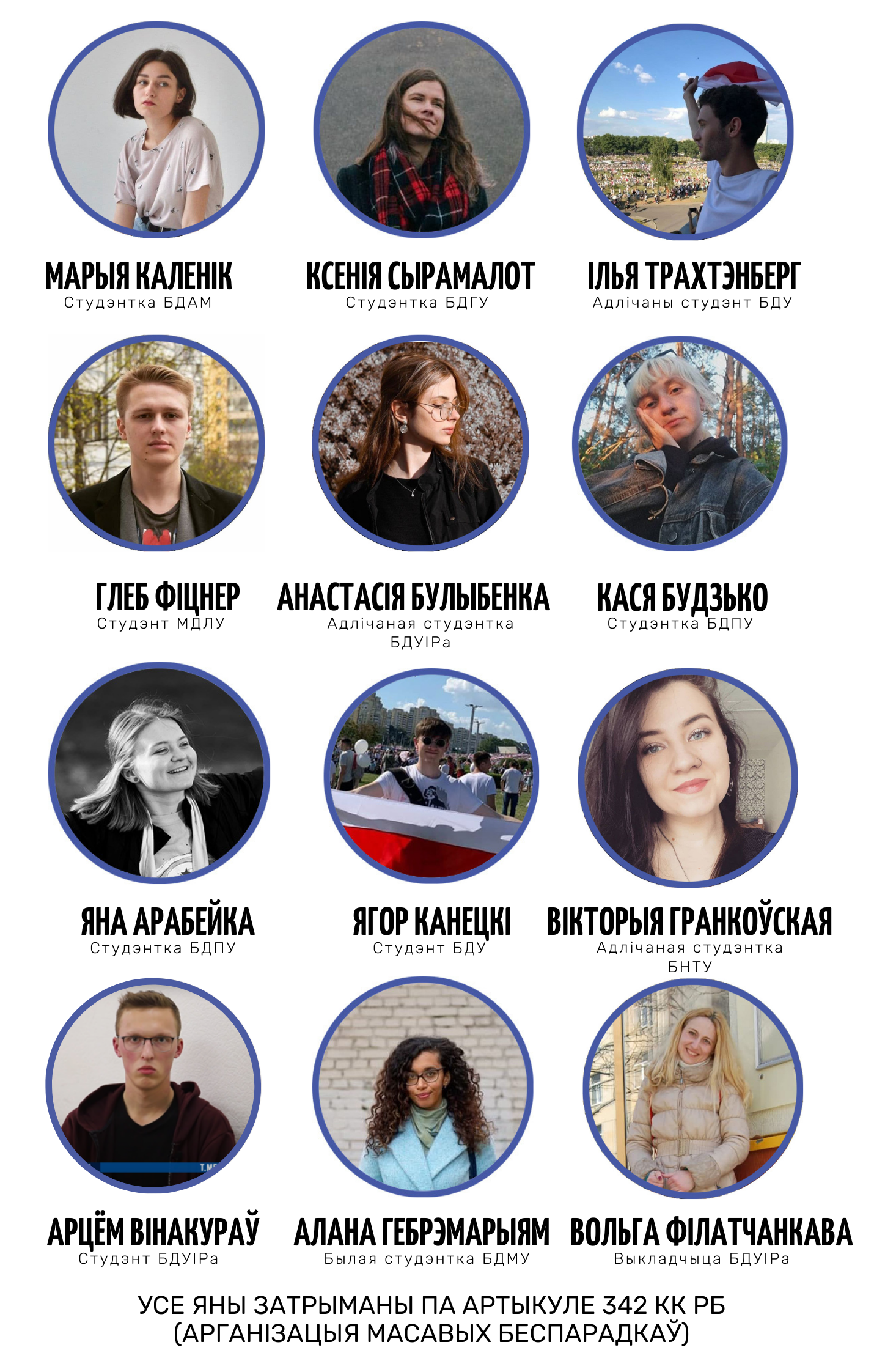 Але ёсць і тыя, каму пашанцавала менш. Зараз адзінаццаць студэнтаў праходзяць падазраванымі па крымінальных справах і знаходзяцца ў СІЗА на Валадарцы. Пяць з іх прыхільнікі ЗБСу. Ім інкрымінуюць артыкул 342 КК РБ, а менавіта арганізацыю масавых беспарадкаў. Дзесяць з іх прызнаныя палітвязнямі.